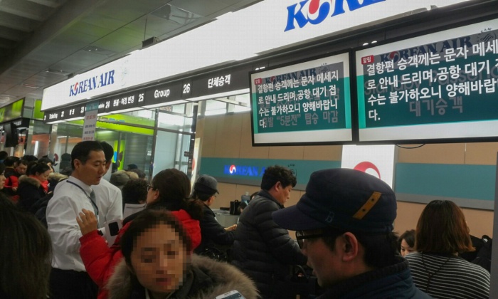 (서울=포커스뉴스) 32년 만에 폭설로 제주국제공항이 폐쇄된지 3일째 되는 25일 오후 제주국제공항 대합실에 모인 관광객들이 항공권을 발권하기 위해 줄을 서 있다. 국토교통부는 25일 오후 12시를 기해 운항을 재개한다고 밝혔다. 하지만 항공기에 쌓인 눈을 제거하는 등 작업들이 남아 있어 실제적인 운항재개는 오후 3시부터 이루어질 전망이다. <사진제공=김세희 사진가>