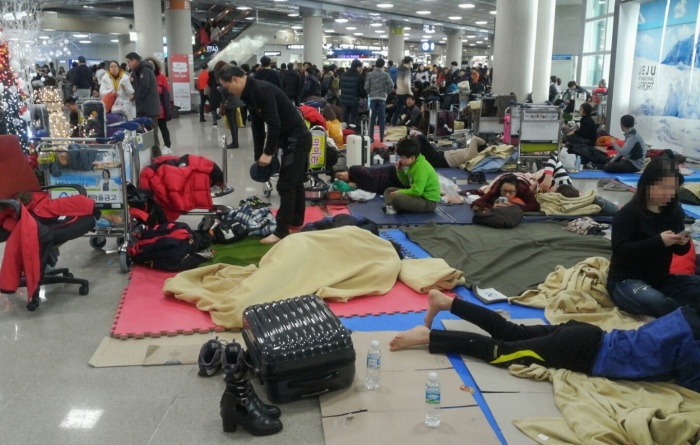 (서울=포커스뉴스) 32년 만에 폭설로 제주국제공항이 폐쇄된지 3일째 되는 25일 오전 제주국제공항 대합실에 모인 관광객들이 운항 재개를 기다리며 바닥에 누워 있다.