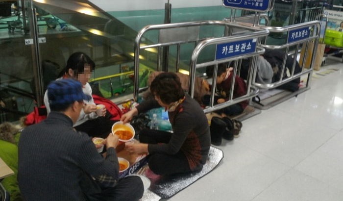 | △ 제주국제공항 폭설, 바닥에 앉아 끼니 때우기 |