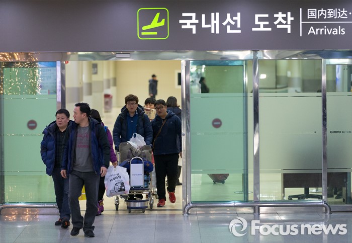 (서울=포커스뉴스) 폭설과 한파로 사흘째 운항이 중단됐던 제주공항에 갇혀있던 탑승객들이 25일 오후 서울 강서구 김포국제공항 국내선으로 입국하고 있다.