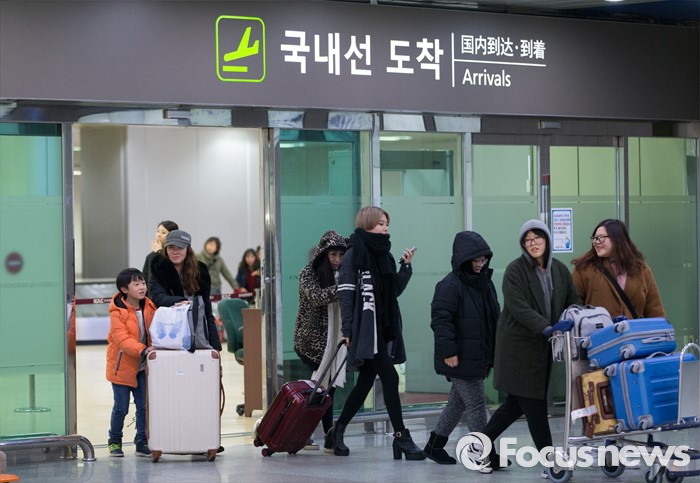 (서울=포커스뉴스) 폭설과 한파로 사흘째 운항이 중단됐던 제주공항에 갇혀있던 탑승객들이 25일 오후 서울 강서구 김포국제공항 국내선으로 입국하고 있다.