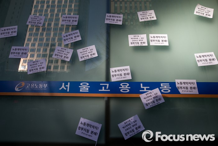 (서울=포커스뉴스) 25일 오후 서울 중구 지방고용노동청 앞에서 열린 '민주노총 수도권 총파업 결의대회'에 참가한 노조원이 노동청 벽에 붙인 항의 스티커들이 하트 모양을 이루고 있다.