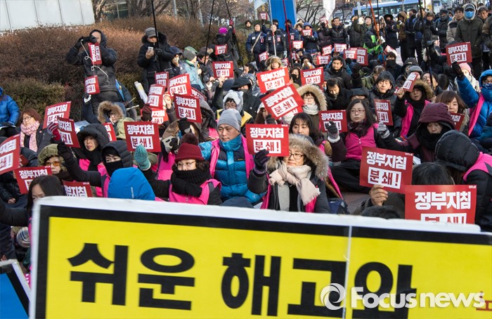 (서울=포커스뉴스) 25일 오후 서울 중구 지방고용노동청 앞에서 열린 '민주노총 수도권 총파업 결의대회'에 참가한 노조원이 구호를 외치고 있다.