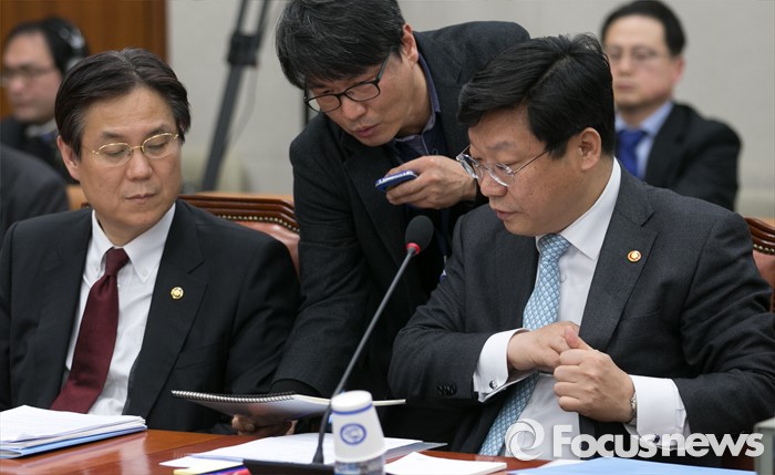 (서울=포커스뉴스) 25일 오후 서울 여의도 국회에서 열린 산업통상자원위원회 전체회의에 참석한 주형환(오른쪽) 산업통상자원부 장관과 이관섭(왼쪽) 1차관이 관계자로부터 자료를 받고 있다.