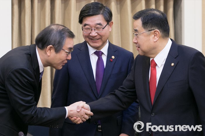 (서울=포커스뉴스) 김정훈(오른쪽) 새누리당 정책위의장과 정재찬(왼쪽) 공정거래위원장이 26일 오전 서울 여의도 국회 귀빈식당에서 열린 '임금 체불 및 하도급대금 부조리 해결' 합동 당정협의에 참석해 악수하고 있다.