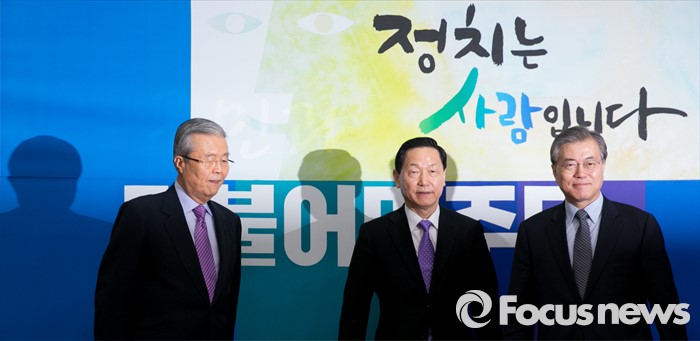 (서울=포커스뉴스) 26일 오전 서울 여의도 국회에서 열린 더불어민주당 인재영입위원회 1차 회의에 문재인(오른쪽부터) 대표, 김상곤 인재영입위원장, 김종인 선대위원장이 참석하고 있다.