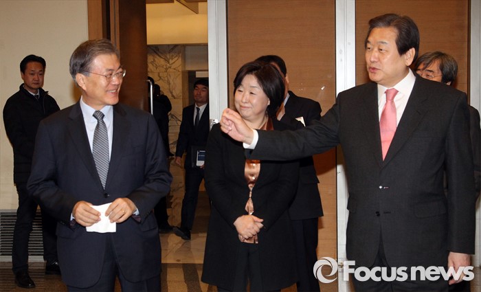 (서울=포커스뉴스) 중장기 어젠다 추진 전략회의가 26일 대한상공회의소 국제회의장에서 열린 가운데 회의전 3당 대표와 기업인들이 티타임을 갖고 있다.