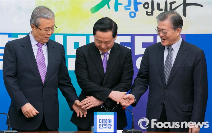 (서울=포커스뉴스) 26일 오전 서울 여의도 국회에서 열린 더불어민주당 인재영입위원회 1차 회의에 참석한 문재인(오른쪽부터) 대표, 김상곤 인재영입위원장, 김종인 선대위원장이 취재진을 향해 포즈를 취하고 있다.