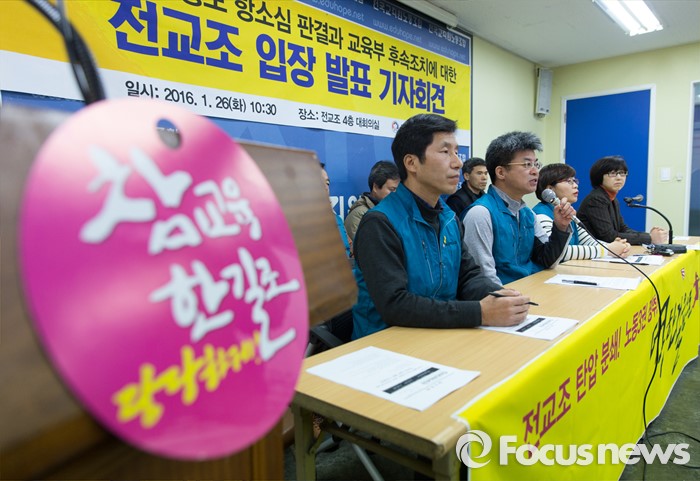 (서울=포커스뉴스) 26일 오전 서울 서대문구 전국교직원노동조합 대회의실에서 변성호(오른쪽 세번째) 전교조 위원장이 법외노조통보 항소심 판결과 교육부 후속조치에 대한 전교조 입장 발표 기자회견에 참석해 인사말을 하고 있다.