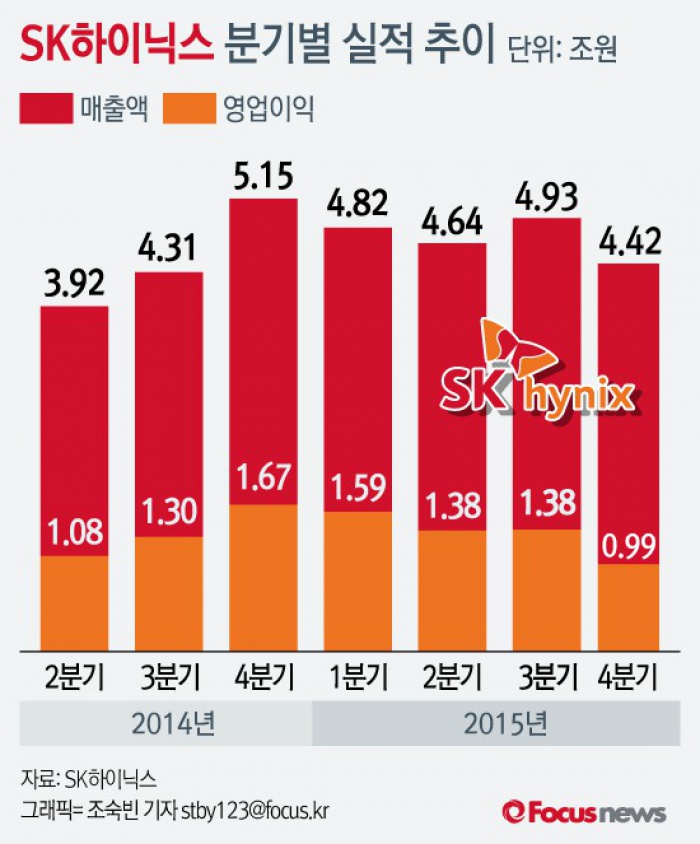 김준호 SK하이닉스 경영지원부문 사장은 "메모리시장에 대한 우려가 높아지고 있는 상황이지만 SK하이닉스는 지난해까지 3년 연속 사상최고의 실적(연간 누적매출 기준)을 경신했다"며 "기업DNA(위기극복DNA)를 이용해 올해를 더 강한 한해로 만들 것"이라고 밝혔다.(서울=포커스뉴스) SK하이닉스가 26일 공시한 자료에 따르면 지난해 4분기의 영업이익은 9889억원으로 지난해 3분기(1조3832억원)에 비해 28.5% 감소했으며,매출액은 4조4160억원으로 작년 3분기(4조9250억원)대비 10.3% 감소한 수치다. 2016.01.26 조숙빈 기자