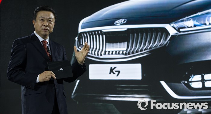 (서울=포커스뉴스) 26일 오전 서울 강남구 그랜드 인터컨티넨탈 서울 파르타스에서 열린 '기아차 올 뉴 K7 신차발표회'에서 황정렬 기아차 PM(프로젝트매니지먼트) 총괄 전무가 발표를 하고 있다.