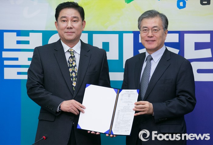 (서울=포커스뉴스) 문재인(오른쪽) 더불어민주당 대표가 26일 오후 서울 여의도 국회에서 열린 인재영입 기자회견에 참석해 김병기 전 국가정보원 인사처장으로부터 입당원서를 전달받은 뒤 포즈를 취하고 있다.
