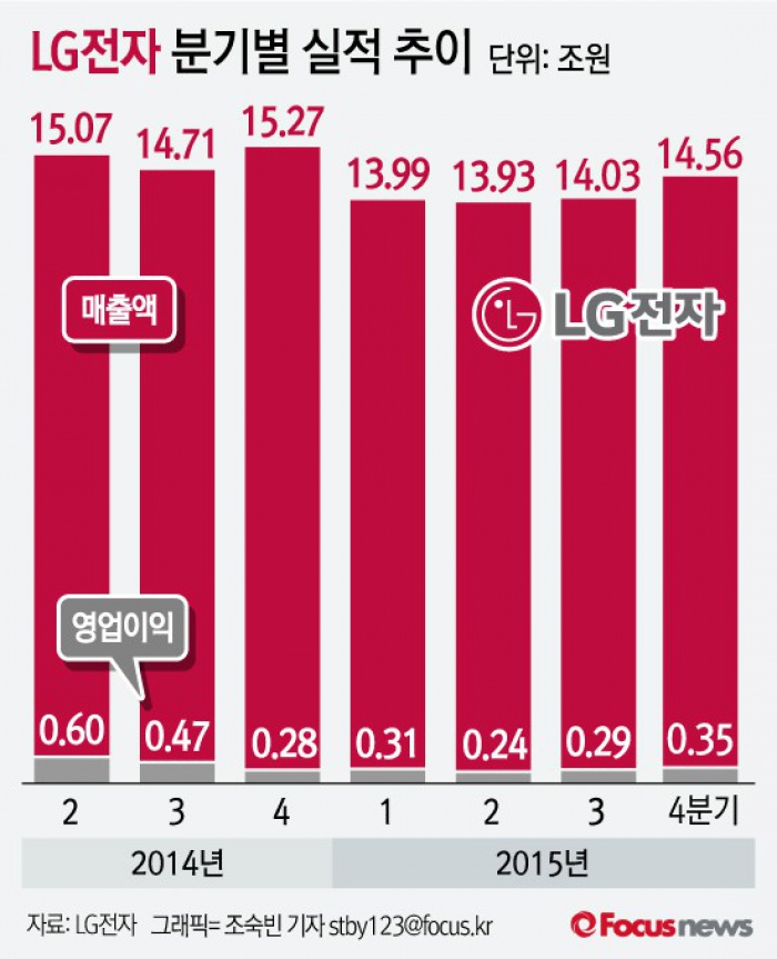 LG전자의 4분기 매출액은 14조5601억원을 기록했다. 작년 3분기(14조288억원)보다 3.8% 증가한 수치다. 2014년 4분기(15조2721억원)보다는 4.7% 감소했다.
