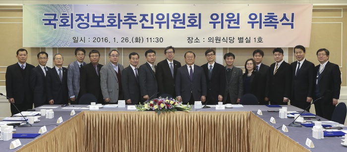 (서울=포커스뉴스) 박형준 국회 사무총장이 26일 오전 서울 여의도 국회에서 국회정보화추진위원회 위원들에게 위촉장을 수여한 뒤 기념촬영을 하고 있다. 위원장인 박 사무총장은 이날 정부·공공기관·대학 및 기업의 정보화 전문가 14인에게 위촉장을 수여한 뒤 국회정보화 중장기 발전계획에 대해 논의했다. <사진제공=국회사무처>
