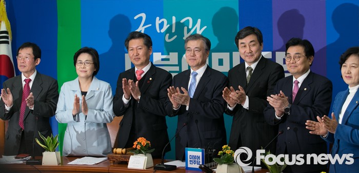 (서울=포커스뉴스) 문재인 더불어민주당 대표 등 지도부가 27일 오전 서울 여의도 국회에서 열린 최고위원회의에 앞서 취재진을 향해 포즈를 취하고 있다. 왼쪽부터 이용득, 유승희, 정청래 최고위원, 문 대표, 이종걸 원내대표, 전병헌, 추미애 최고위원.