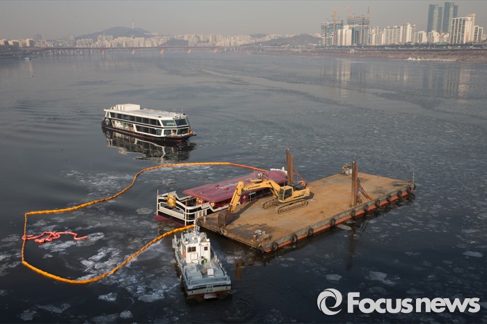 (서울=포커스뉴스) 27일 오전 서울 한강 영동대교 아래에서 침수된 한강유람선을 인양하기 위해 바지선이 정박해 있다.