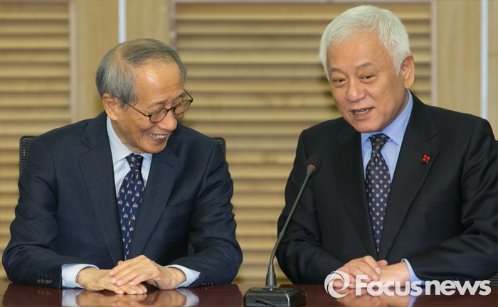 (서울=포커스뉴스) 27일 오전 서울 여의도 국회 의원회관에서 열린 국민의당-통합신당 통합발표 기자회견에 윤여준(왼쪽) 국민의당 공동창당준비위원장과 김한길 상임부위원장이 대화하고 있다.