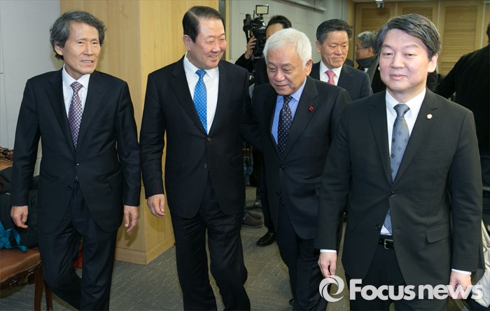 (서울=포커스뉴스) 27일 오전 서울 여의도 국회 의원회관에서 국민의당-통합신당 통합발표 기자회견을 마친 뒤 한상진(왼쪽부터) 국민의당 공동창당준비위원장, 박주선 통합신당 창당준비위원장, 김한길 국민의당 상임부위원장, 안철수 인재영입위원장이 퇴장하고 있다.