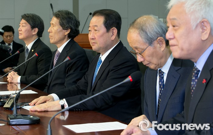 (서울=포커스뉴스) 27일 오전 서울 여의도 국회 의원회관에서 열린 국민의당-통합신당 통합발표 기자회견에 참석한 안철수(왼쪽부터) 국민의당 인재영입위원장, 한상진 공동창당준비위원장, 박주선 통합신당 창당준비위원장, 윤여준 국민의당 공동창당준비위원장, 김한길 상임부위원장이 발표문을 낭독하고 있다.