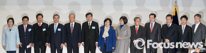 (서울=포커스뉴스) 27일 오후 서울 여의도 국회에서 열린 더불어민주당 중앙위원회의에 참석한 문재인 대표 등 지도부와 김종인 선거대책위원장 겸 비상대책위원장 등 비대위원들이 취재진을 향해 포즈를 취하고 있다. 왼쪽부터 유승희, 전병헌, 정청래 최고위원, 문 대표, 김 위원장, 이종걸 원내대표, 추미애 최고위원, 박영선, 우윤근, 이용섭, 변재일, 김병관, 표창원 비대위원.