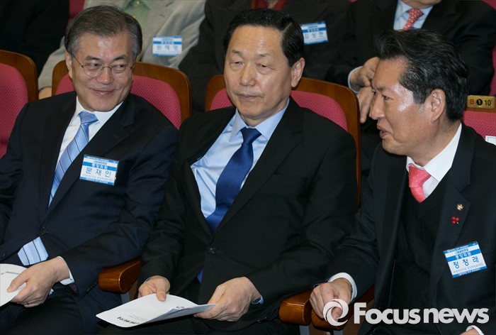 (서울=포커스뉴스) 27일 오후 서울 여의도 국회에서 열린 더불어민주당 중앙위원회의에 참석한 문재인(왼쪽부터) 대표, 김상곤 인재영입위원장, 정청래 최고위원이 대화하고 있다.