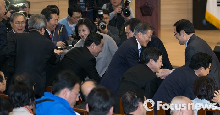 (서울=포커스뉴스) 27일 오후 서울 여의도 국회에서 열린 더불어민주당 중앙위원회의에 참석한 문재인 대표 등 지도부와 비대위원들이 인사하고 있다.