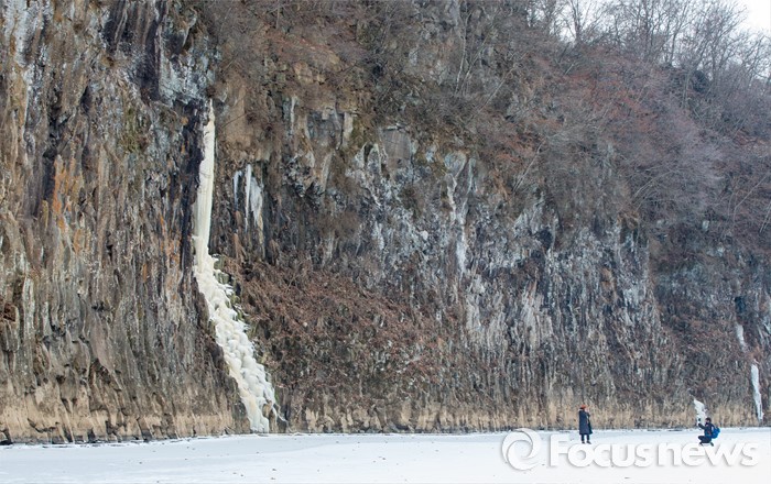 (철원=포커스뉴스) 26일 강원 철원군 현무암 협곡 주상절리 아래로 얼어붙은 한탄강 위에서 여행객이 기념촬영을 하고 있다.