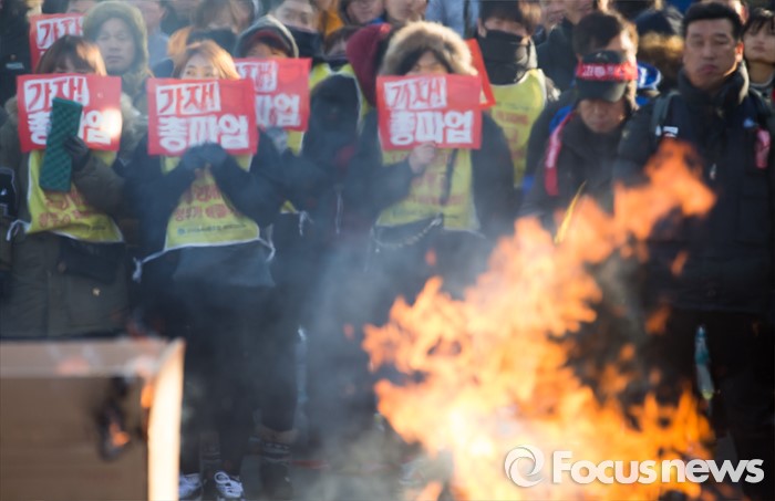 (서울=포커스뉴스) 27일 오후 서울 종로구 세종로 소공원에서 열린 '민주노총 총파업 수도권대회'에 참가한 민주노총 조합원들이 정부의 노동법 개정 중단을 촉구하는 퍼포먼스를 펼치고 있다.