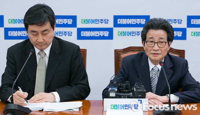 (서울=포커스뉴스) 이목희 더불어민주당 정책위의장이 28일 오전 서울 여의도 국회에서 열린 정책조정회의에 참석해 모두발언을 하고 있다. 왼쪽은 이종걸 원내대표.