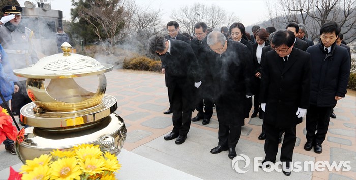 (서울=포커스뉴스) 28일 오전 서울 동작구 국립서울현충원에서 김종인 선거대책위원장 겸 비대위원장이 김대중 전 대통령 묘역 참배를 하고 있다.