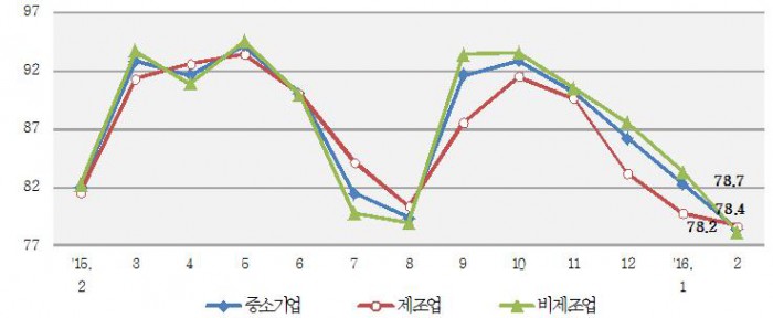 중소기업중앙회(회장·박성택)는 최근 중소기업 3150개사(제조업 1500개. 비제조업 1650개)를 대상으로 실시한 '2016년 2월 경기전망' 조사 결과를 28일 발표했다.