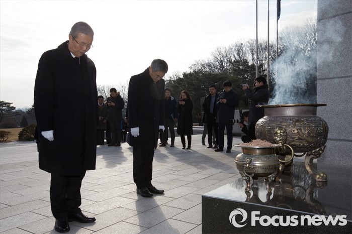 (서울=포커스뉴스) 28일 오전 서울 강북구 국립 4.19 묘지에서 김종인 선거대책위원장 겸 비대위원장이 사월 학생 혁명 기념탑 참배 후 묵념을 하고 있다.