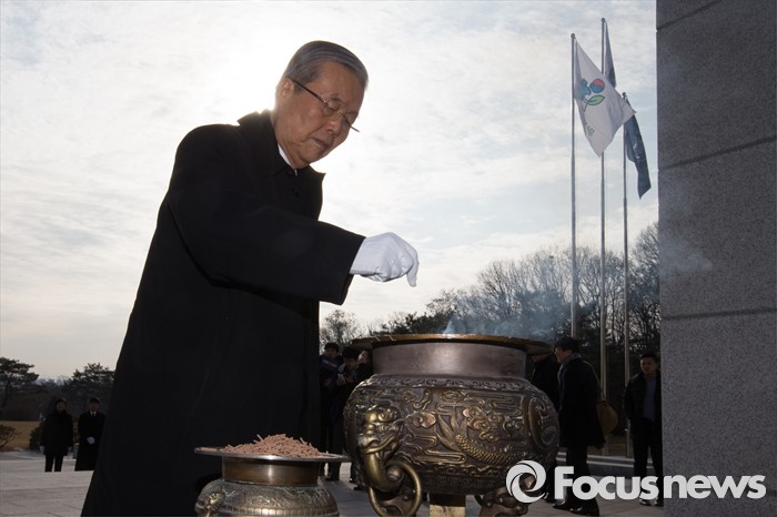 (서울=포커스뉴스) 28일 오전 서울 강북구 국립 4.19 묘지에서 김종인 선거대책위원장 겸 비대위원장이 사월 학생 혁명 기념탑을 방문해 분향하고 있다.