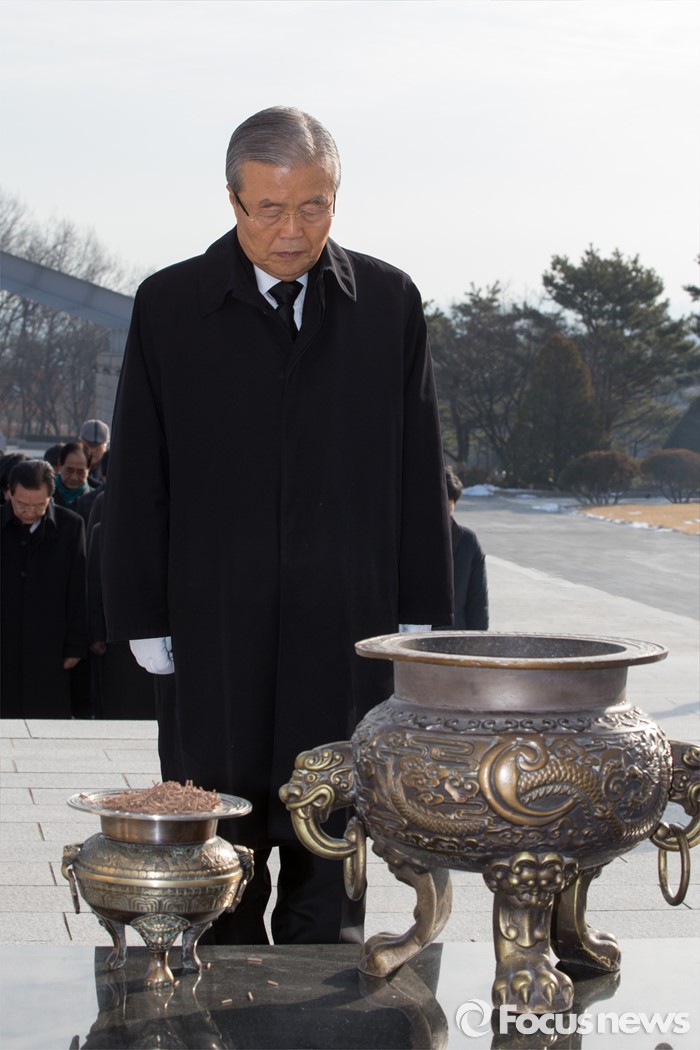 (서울=포커스뉴스) 28일 오전 서울 강북구 국립 4.19 묘지에서 김종인 선거대책위원장 겸 비대위원장이 사월 학생 혁명 기념탑 참배 후 묵념을 하고 있다.