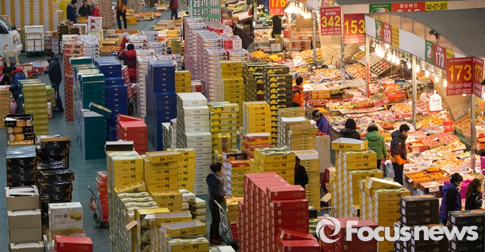 (대전=포커스뉴스) 설 멸정을 앞두고 28일 오전 대전 유성구 농수산물도매시장에서 상인들이 대목준비에 바쁘게 움직이고 있다.