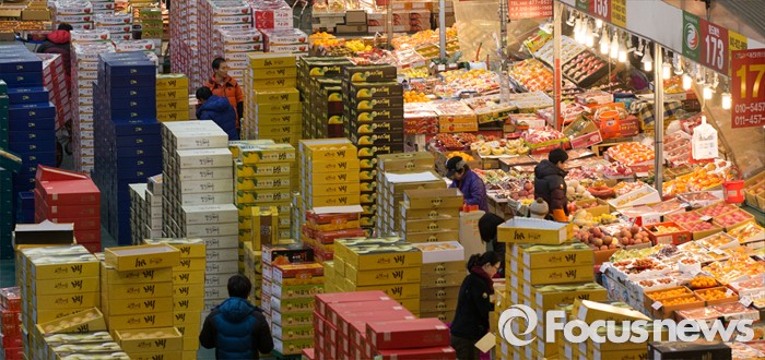 (대전=포커스뉴스) 설 멸정을 앞두고 28일 오전 대전 유성구 농수산물도매시장에서 상인들이 대목준비에 바쁘게 움직이고 있다.