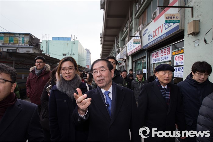 (서울=포커스뉴스) 박원순 서울시장이 28일 오전 서울 종로구 세운상가에서 세운상가 재생사업 현장 설명회를 마친 후 세운상가 주변 경관을 둘러보고 있다.