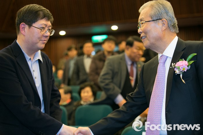 (서울=포커스뉴스) 28일 오후 서울 여의도 국회도서관에서 열린 더불어민주당 60년사 출판기념회에 참석한 김종인(오른쪽) 비대위원장과 故 김대중 전 대통령의 삼남 홍걸 씨가 인사하고 있다.