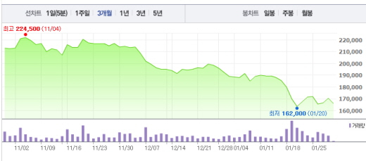 2015년 4분기 이마트의 영업이익은 838억원으로 전년 동기 대비 29.2% 하락했다.이마트 주가흐름<사진출처=네이버 캡쳐>
