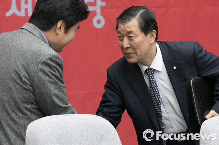 (서울=포커스뉴스) 원유철(왼쪽) 새누리당 원내대표와 황진하 사무총장이 29일 오전 서울 여의도 국회에서 열린 원내대책회의에 참석해 악수하고 있다.