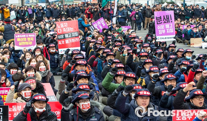 (서울=포커스뉴스) 29일 오후 서울역 광장에서 열린 '한국노총 전국 단위노조 대표자 총력투쟁 결의대회'에 참석한 조합원들이 정부가 발표한 양대 행정지침 폐기를 촉구하는 구호를 외치고 있다.