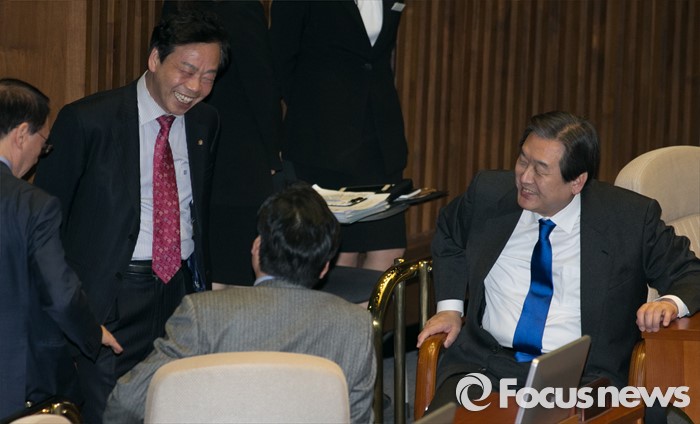 (서울=포커스뉴스) 29일 오후 서울 여의도 국회에서 예정된 338회 국회(임시회) 4차 본회의에 참석한 김무성 새누리당 대표와 원유철 원내대표, 이완영 의원이 대화하고 있다.