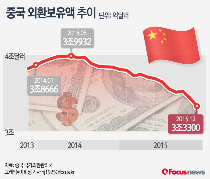 자본유출과 위안화 가치 하락을 막기 위한 정부의 달러 매도에 외환보유액도 줄어들고 있다. 중국의 외환보유액은 2015년말 기준 외환보유액은 3조3330억달러로 2014년 6월 3조9932억달러로 정점을 찍은 이후 1년6개월 만에 6629억달러나 줄었다.