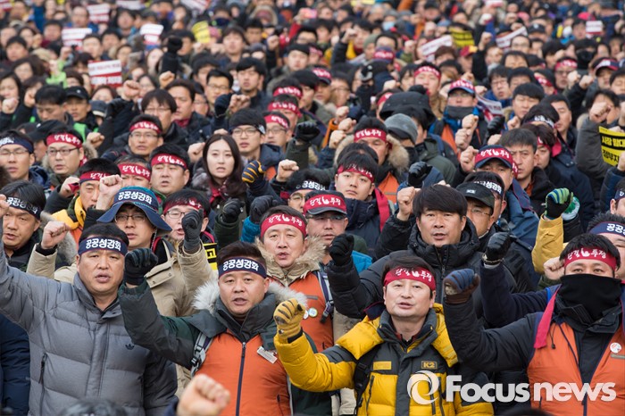 (서울=포커스뉴스) '민주노총 전국노동자대회'가 열린 30일 오후 서울광장에서 민주노총 조합원들이 정부의 '일반 해고'와 '취업규칙 변경' 양대 지침 철회와 노동개악 중단을 촉구하고 있다.