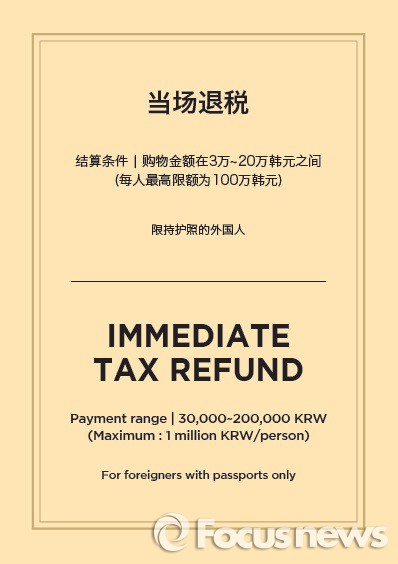 외국인 부가세 즉시환급이란 사후면세점의 일환이다. 외국인 관광객이 체류기간 내 물품가격 100만원 한도 안에서, 구매 건별로 3만원 이상 20만원 미만 물건을 구입할 때 백화점 매장에서 부가세를 제외한 금액으로 바로 구매할 수 있는 제도다.