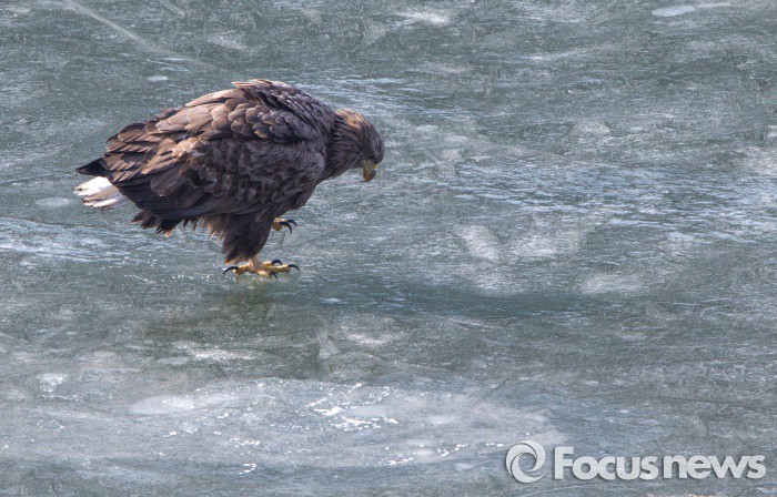 (남양주=포커스뉴스) 한파가 다시 엄습, 서울지방 아침기온이 영하 9도로 떨어진 1일 오전 경기도 남양주시 팔당리 한강이 다시 꽁꽁 얼어붙은 곳으로 흰꼬리수리(천연기념물 243호) 가 내려 앉아 얼음속의 물고기를 쳐다보고 있다. 겨울철새 흰꼬리수리는 이곳에서 주로 누치를 잡아 먹는다.
