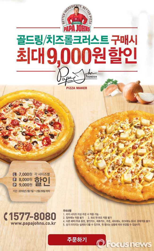(서울=포커스뉴스) 피자브랜드 한국파파존스는 2월 한달간 라지사이즈 이상 피자에 골드링크러스트나 치즈롤크러스트을 주문하면 최대 9000원을 할인한다.