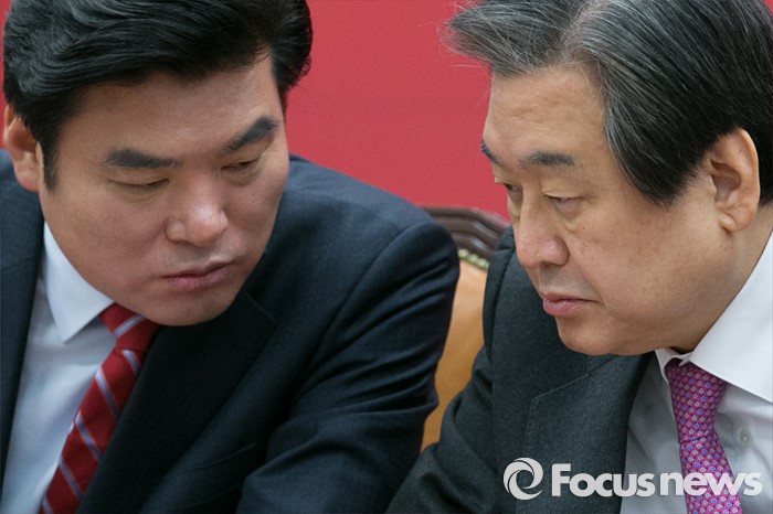 (서울=포커스뉴스) 김무성(오른쪽) 새누리당 대표와 원유철 원내대표가 1일 오전 서울 여의도 국회에서 열린 최고위원회의에 참석해 대화하고 있다.