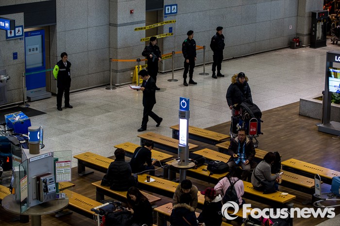 (인천공항=포커스뉴스) 인천국제공항에 폭발물 의심 물체와 함께 아랍어로 된 협박성 메모가 발견된 사건 수사가 진행되고 있는 1일 오후 폭발물 의심 물체가 발견된 인천공항 입국장 화장실에서 경찰병력이 경계 근무를 서고 있다.