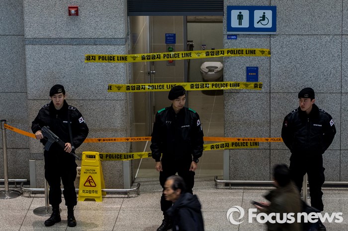 (인천공항=포커스뉴스) 인천국제공항에 폭발물 의심 물체와 함께 아랍어로 된 협박성 메모가 발견된 사건 수사가 진행되고 있는 1일 오후 폭발물 의심 물체가 발견된 인천공항 입국장 화장실에서 경찰병력이 경계 근무를 서고 있다.